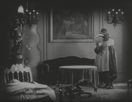 Режиссер чередует крупные и дальние планы, чтобы усилить напряжение. В сцене, где муж застает любовников, мы видим крупным планом искаженную руку. Акцент делается не на удивленном лице мужчины, а на ладони, которая говорит о его эмоциях. Наблюдая за рукой, мы также продолжаем наблюдать за девушкой вамп и ее любовником, что усиливает напряжение и драматизм события.