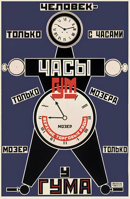 Композиция строится вокруг изображения трёх часов, стилизованных в фигуру человека, тем самым подчёркивая слоган о том, что человек — это, прежде всего, тот, кто носит часы. Чёткое графическое деление и акцент на марку ГУМа дополнительно ориентируют внимание на нужный объект и место покупки. Совместная работа Маяковского и Родченко задала стандарты советской визуальной рекламы и стала основой целого направления графического дизайна.