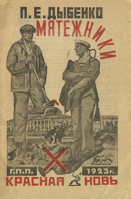 Обложки книг «Мятежники» (1923) и «Основания устройства железнодорожного пути» (1924), созданные Александром Родченко, прекрасно иллюстрируют разные грани конструктивистского подхода к оформлению печатной продукции в начале 1920-х годов. На обложке «Мятежников» комбинируются изобразительные элементы с экспрессивной типографикой: изображены фигуры рабочих и матроса в динамичном, почти героическом позировании, выполненные с подчёркнутой графической линией, а название книги, имя автора, издательство выделены насыщенным красным и строгим чёрным цветом. Шрифтовые элементы располагаются не по одной оси, а под разными углами, что создаёт ощущение движения и напряжения, типичное для революционного искусства этого времени.