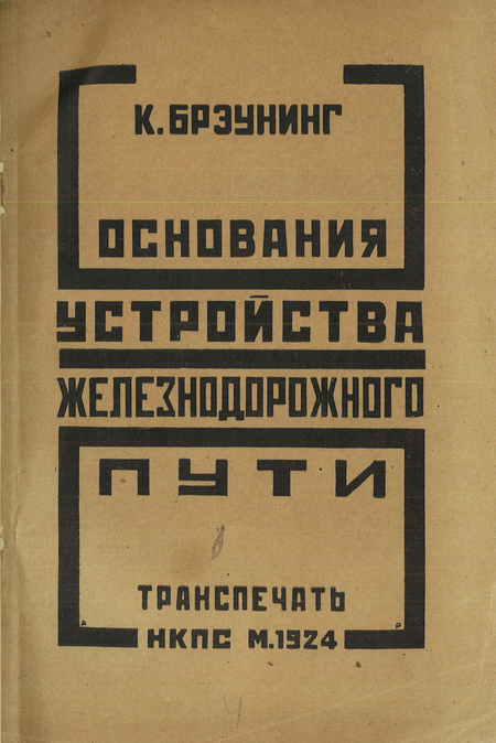 В обложке «Основания устройства железнодорожного пути» использован другой приём — предельная лаконичность, палочный геометрический шрифт и прямоугольные рамки, обрамляющие каждую смысловую зону. Вся композиция построена по принципу функционального минимализма: текст чётко структурирован, выделенные части заголовка располагаются в отдельных блоках, а отсутствие декоративных или иллюстративных элементов подчёркивает сугубо техническую направленность книги.