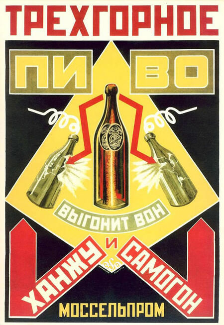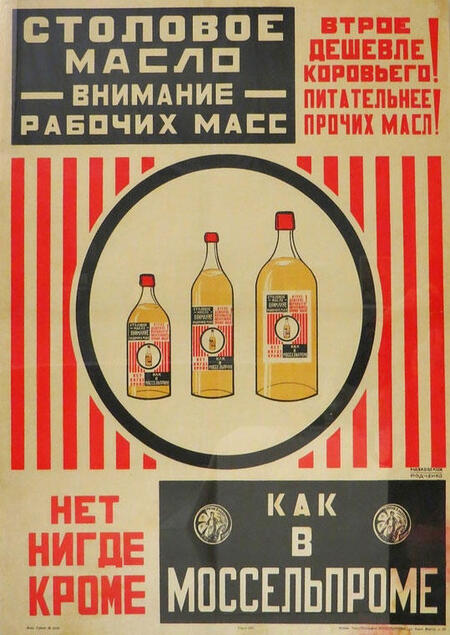 Плакаты Александра Родченко «Внимание рабочих масс: столовое масло!» и «Трехгорное пиво выгонит вон ханжу и самогон» (1920-е) наглядно демонстрируют, как конструктивистская графика работала на массовую агитацию и рекламу в советской эпохе.