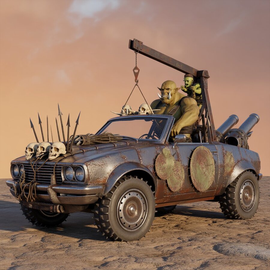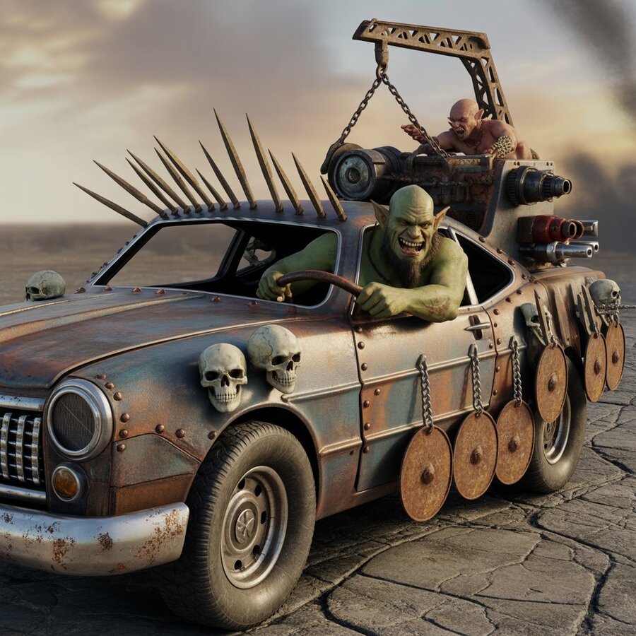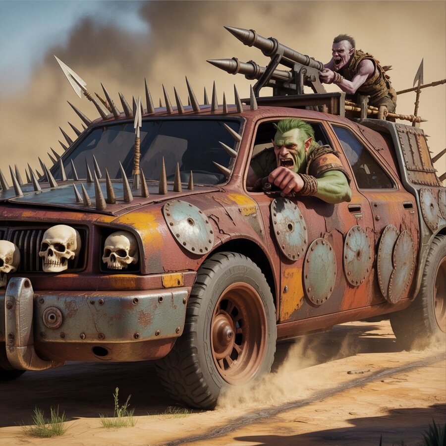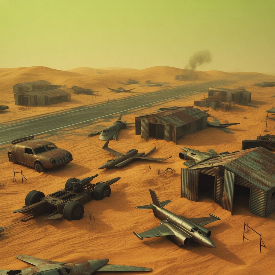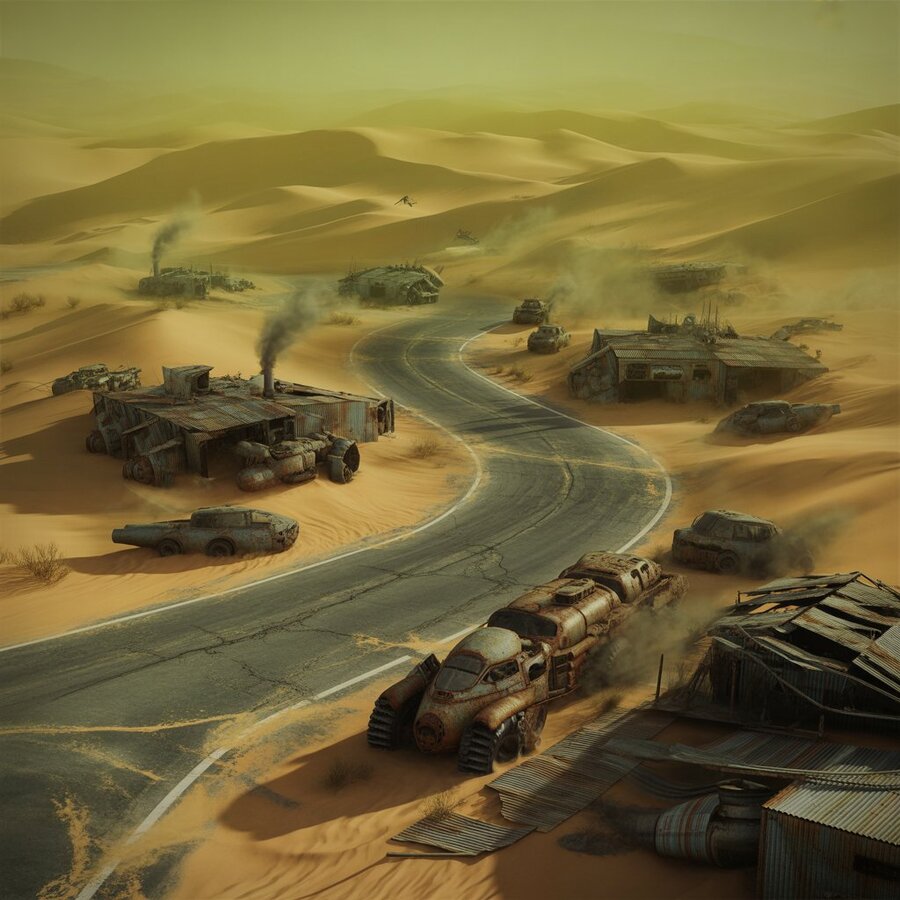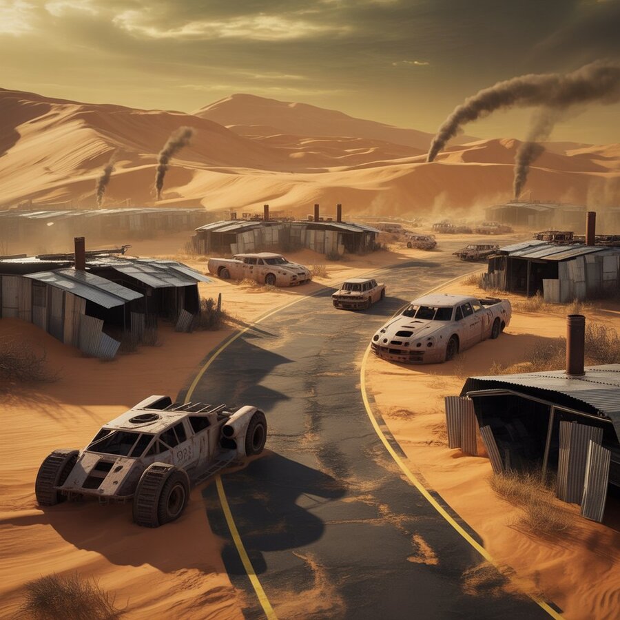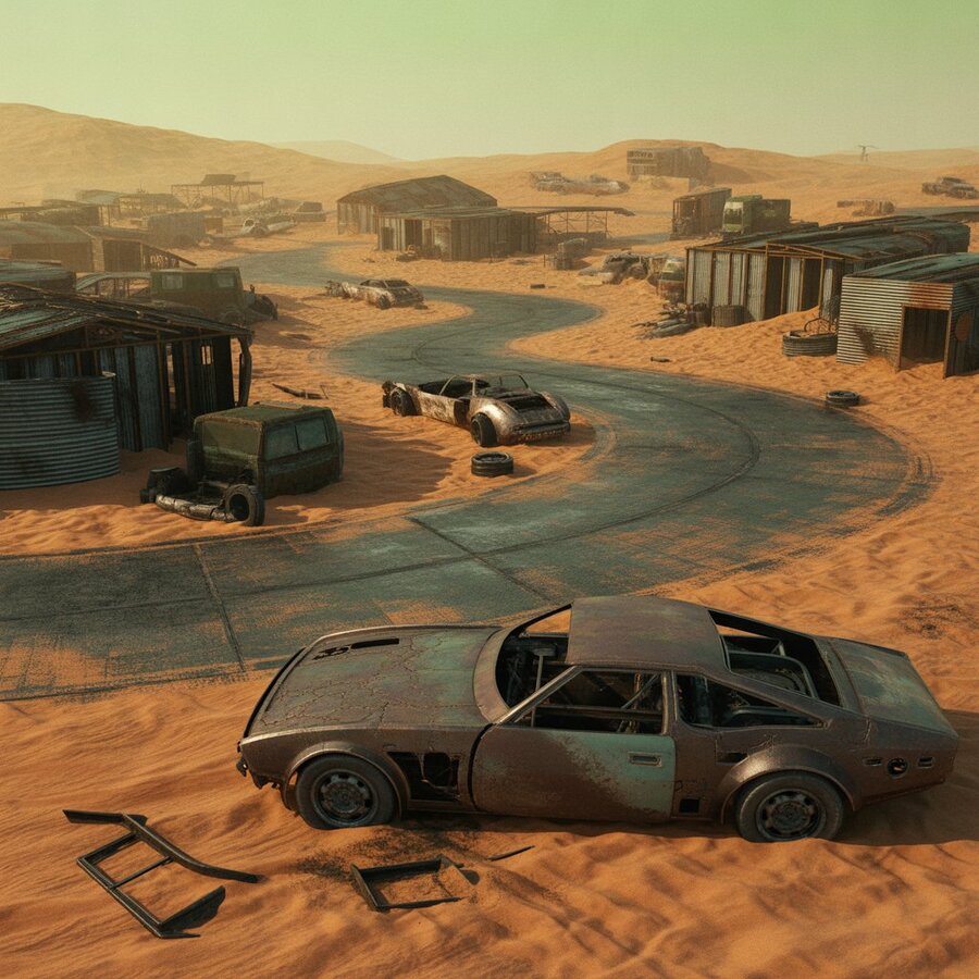 A racing track in the middle of a radioactive desert. The rusty wrecks of steamships and airplanes are scattered across the desert, and here and there you can see shacks built of rusty metal and every