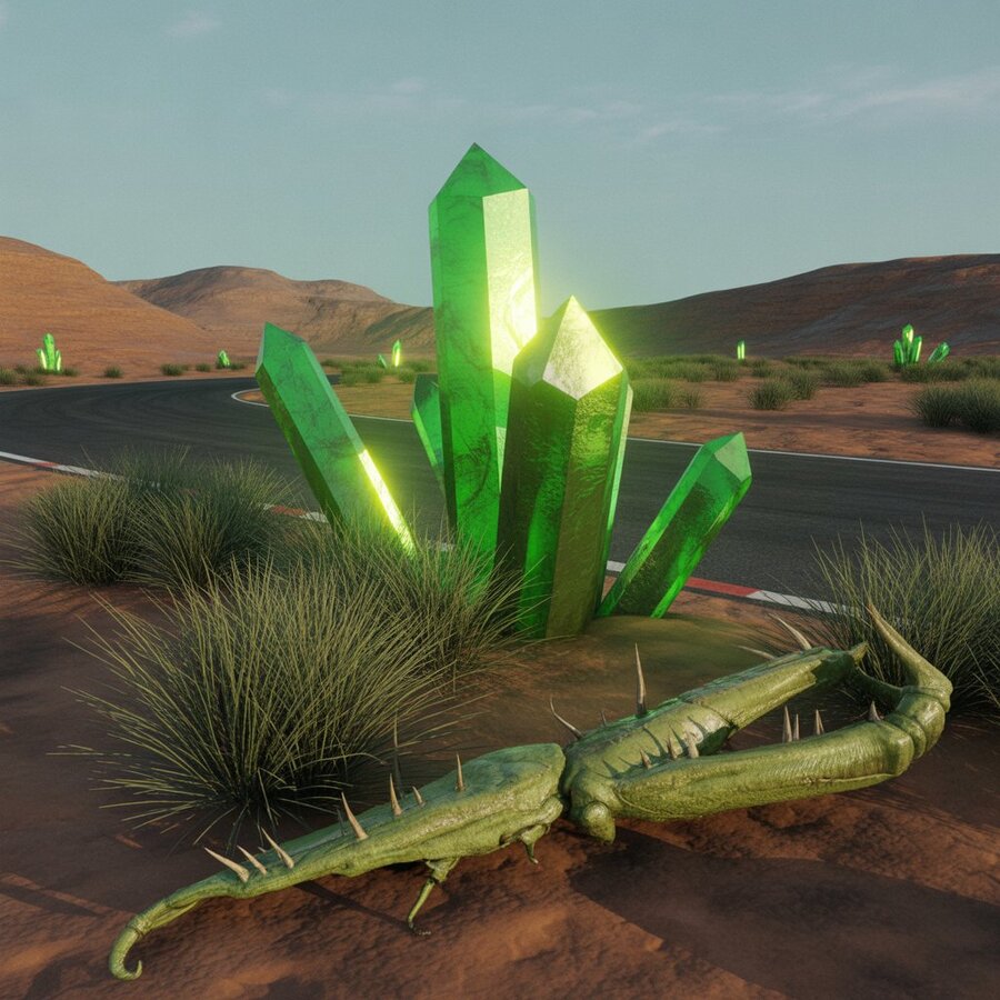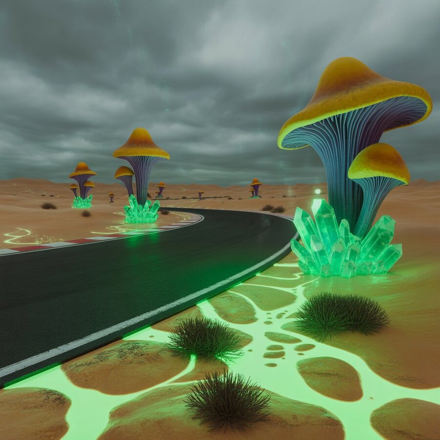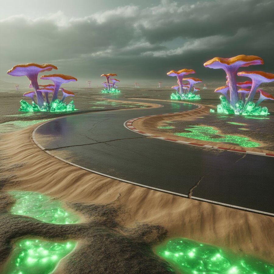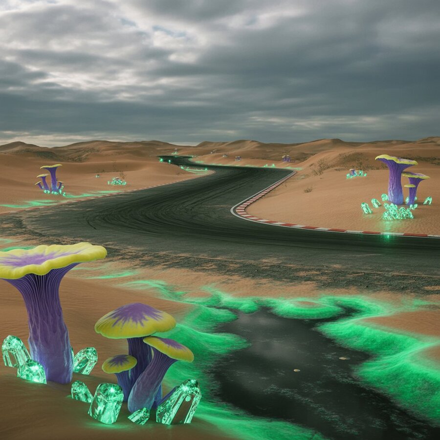 A racing track in the middle of a radioactive desert. Radioactive green crystals of various sizes sprout from the ground here and there, and a faint glow emanates from these crystals. These crystals a