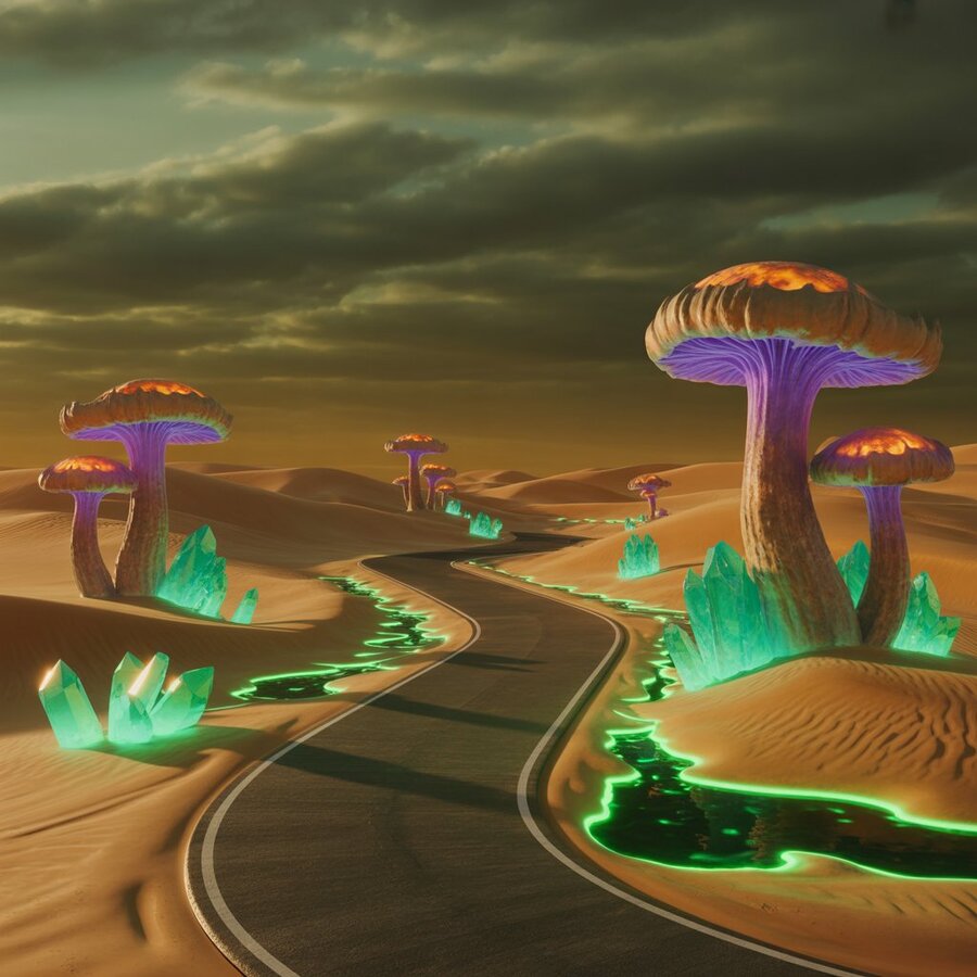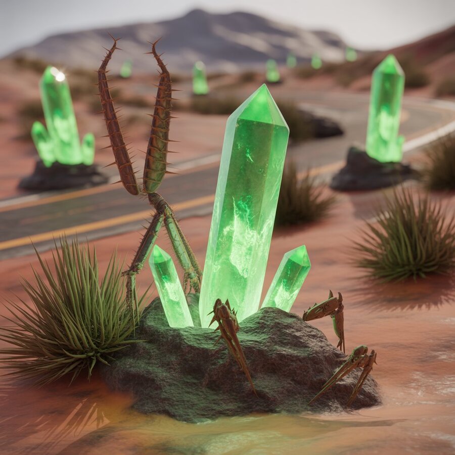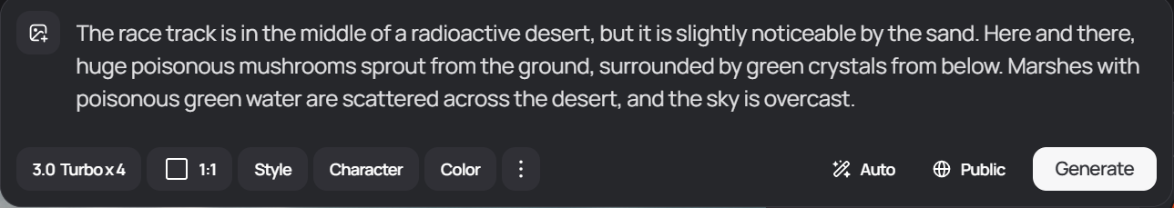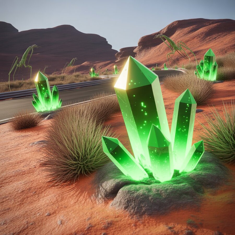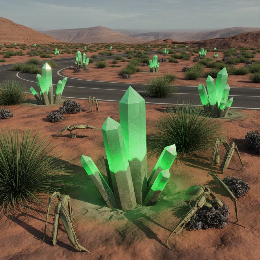 A racing track in the middle of a radioactive desert. Radioactive green crystals of various sizes sprout from the ground here and there, and a faint glow emanates from these crystals. These crystals a