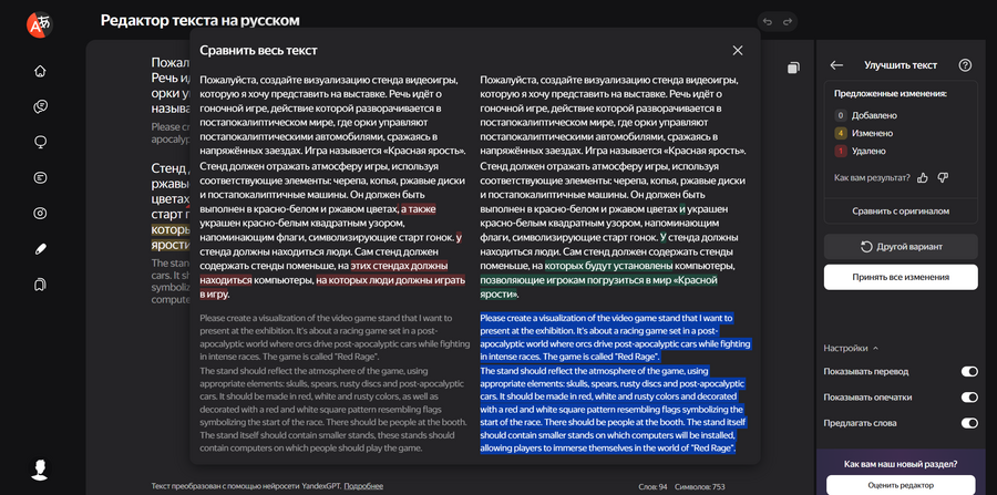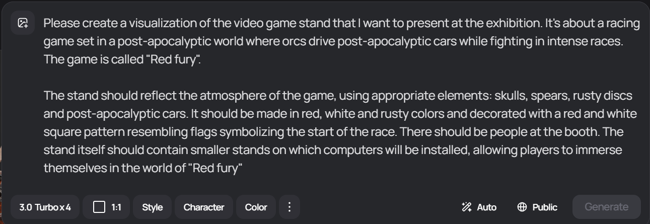 При генерации визуализации стенда сначала был использован YandexGPT для упрощения изначального текста и его видоизменения. Затем изменённая версия была использована в виде промпта.