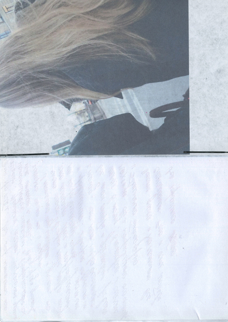 Фотографии сопровождаются записями-письмами, которые остаются скрытыми: страницы склеены, и текст недоступен для чтения. Читателю видны лишь отпечатки ручки с оборотной стороны бумаги