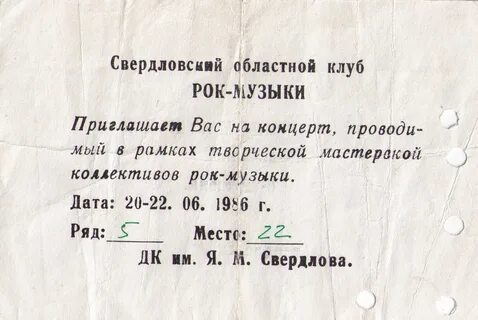 Билет в Свердловский рок-клуб, автор неизвестен, 1986