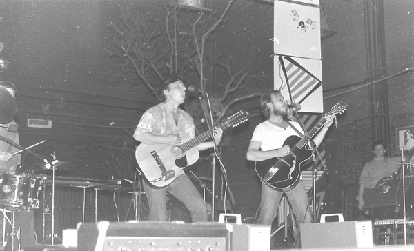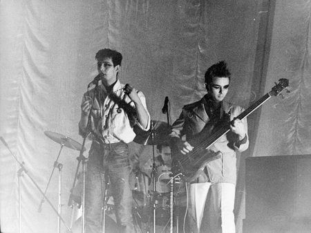 Слева — фотограф Дмитрий Константинов, во время выступления группы «Настя», вторая половина 1980-х. Справа — фотограф Олег Ракович; Вячеслав Бутусов, Егор Белкин, вторая половина 1980-х