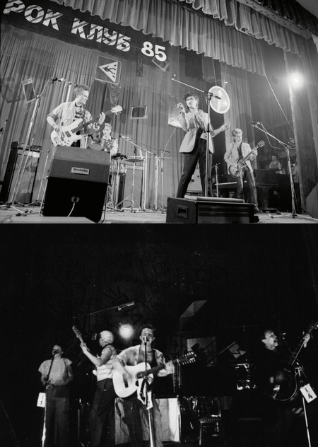 Слева — фотограф Дмитрий Константинов, открытие сезона Свердловского рок-клуба, 1986. Справа — фотограф В. Аршкевич, фестиваль Свердловского рок-клуба, 1986–1987