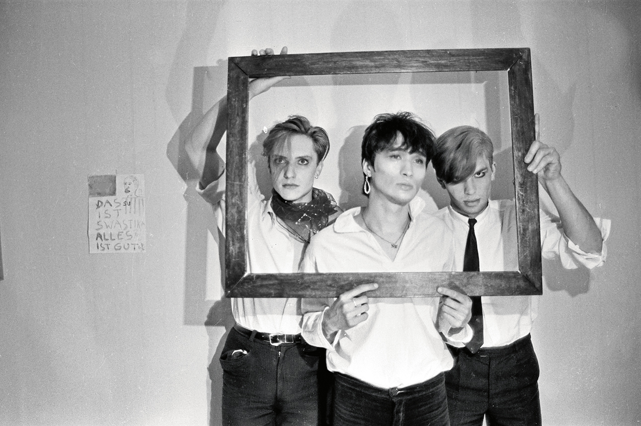 Слева — фото из архива Джоанны Стингрей. Андрей Крисанов, Виктор Цой, Георгий Гурьянов и Тимур Новиков в галерее «АССА», 1985. Справа — фотограф Александр Бойко, фотосессия дома у Гурьянова, 1984