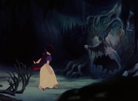 В анимационной адаптации «Белоснежки» от студии «Walt Disney Productions» принцесса вынуждена в спешке покинуть отчий дом. Она бежит в самую глубь леса, и он ей кажется невероятно пугающим, словно за каждым углом поджидают опасности. В фильме страх девушки показывают за счет оживших ветвей, бревен и других чудес природы. Они превращаются в монстров, страшные цепкие лапы, удерживавшие героиню. Лес словно становится волшебным, пугает своей неизвестностью, не даёт сбежать — и нет ему конца. Однако, когда Белоснежка останавливается, выбившись из сил, оказывается, что лес вовсе не страшен, и причиной жутких образов стало эмоциональное состояние героини (сцена медленно отдаляется и становится светлее, проявляя свою радостную и солнечную сторону).