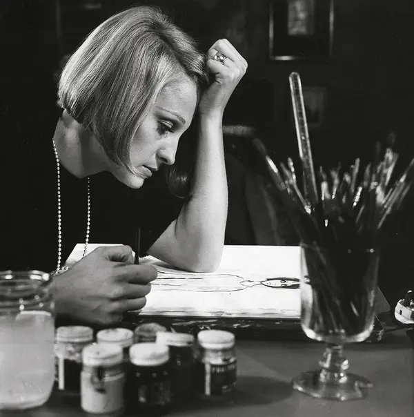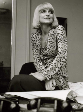 1. Mary Quant with her models, at Heathrow Airport, London, before leaving for a continental fashion tour / 1968 2. Mary Quant at work