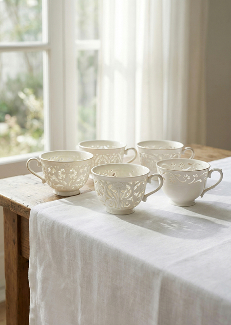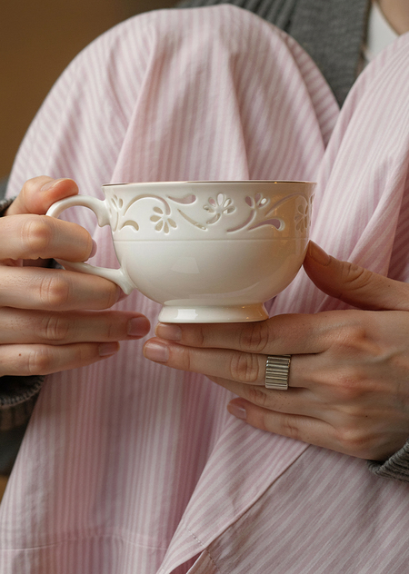Чашки выполнены на основе традиционной техники «рисовое зерно», в которой в стенках фарфора создаются полупрозрачные вставки, пропускающие свет. В этом проекте принцип «рисового зерна» реализуется с помощью цифрового моделирования: отверстия и зоны различной толщины проектируются непосредственно в 3D-модели, что позволяет точно контролировать форму, размер и ритм светопроницаемых элементов. В отличие от ручной керамики, где такие элементы вырезаются вручную, здесь они являются частью геометрии объекта и воспроизводятся с высокой точностью. Кружки печатаются из материалов, имитирующих фарфор, и дополнительно обрабатываются для получения гладкой, прозрачной герметичной внутренней поверхности, пригодной для контакта с горячими напитками. При наполнении чаем свет проходит через прозрачные участки и делает узор видимым, не за счёт окраски, а за счёт структуры материала. Проект направлен на создание функциональной посуды, в которой декоративный эффект достигается не поверхностным декором, а конструкцией и свойствами материала, объединяя традиционный приём и современные технологии 3D-печати.