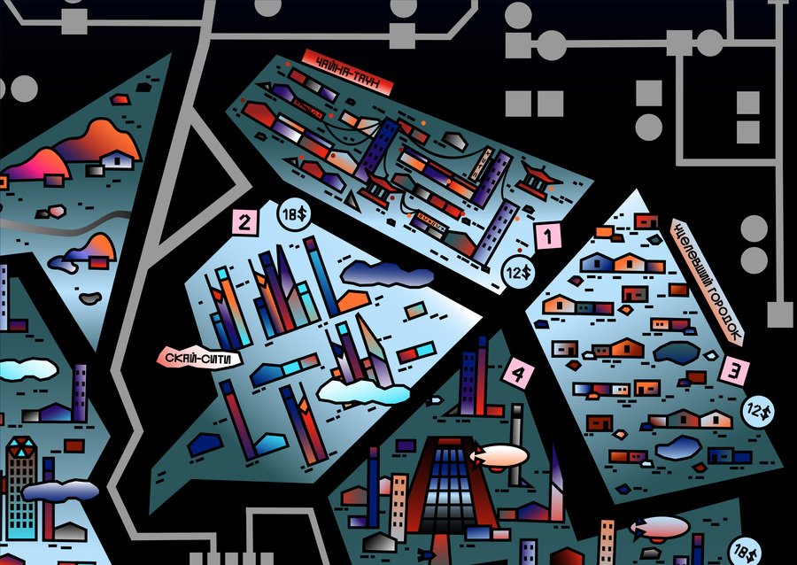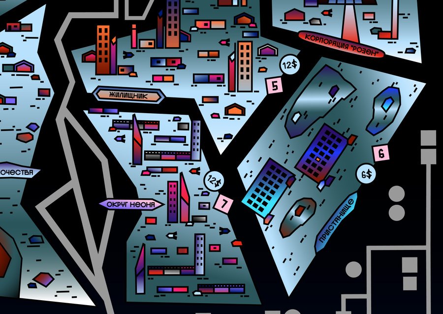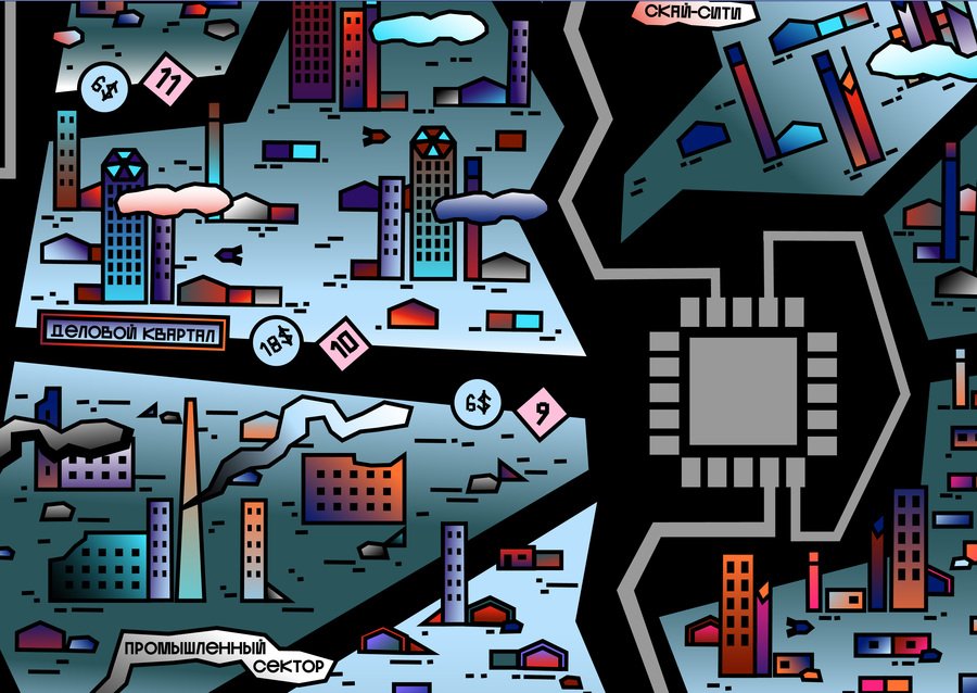 Игровое поле разделено на одиннадцать городских районов.