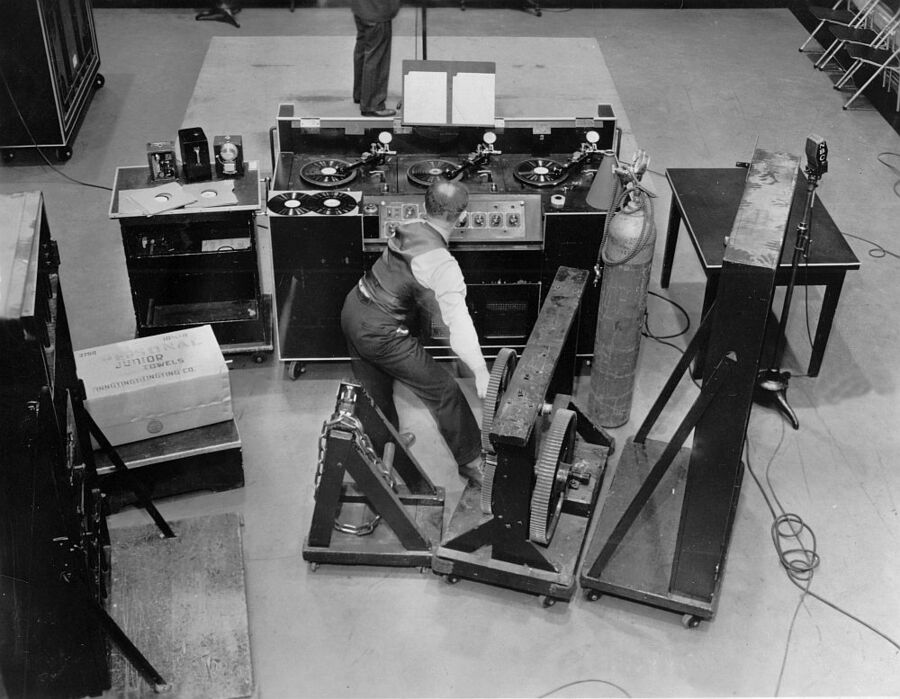 В радио 1920–1950-х годов сборка звука и шумов для эфира представляла собой сложный технический и творческий процесс, значительно отличавшийся от современных методов. Основные звуки записывались либо непосредственно «на живую» во время эфира, либо с помощью ранее механических устройств, таких как фонографы и граммофоны с восковыми дисками. Однако позже, начиная с 1925 года, основным способом стала электроакустическая запись — звук улавливался микрофонами и преобразовывался в электрические сигналы, что ограничивало качество записи и расширяло частотный диапазон.