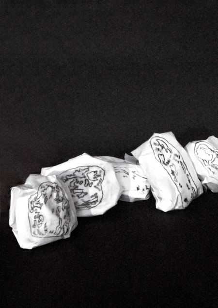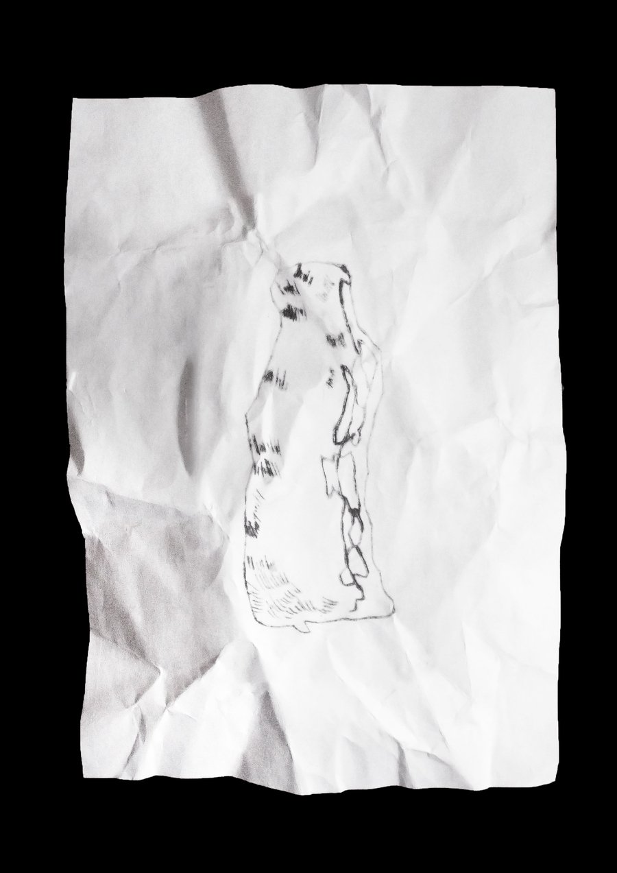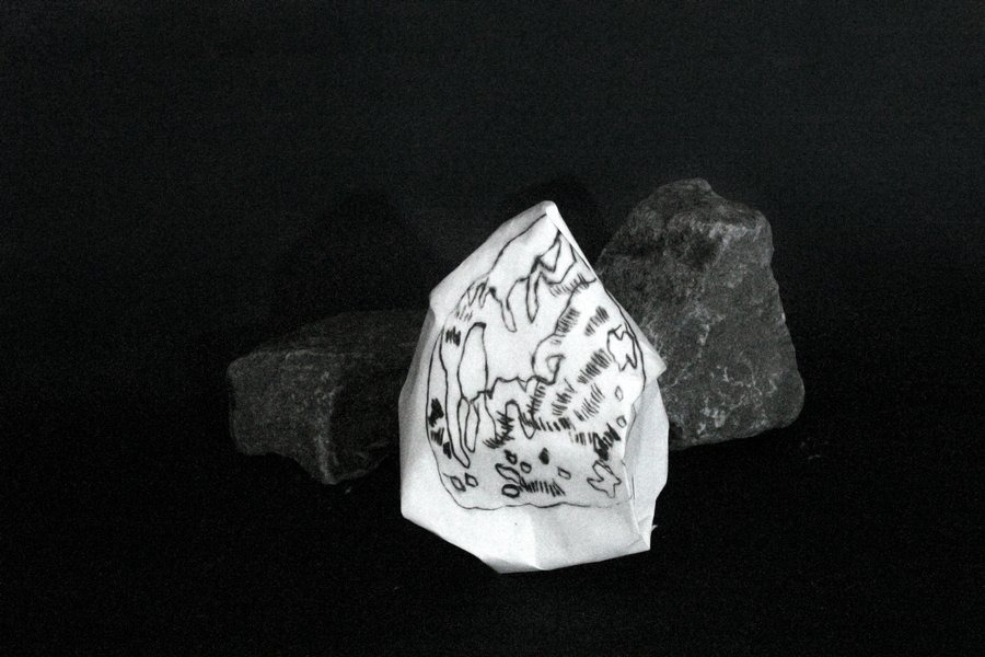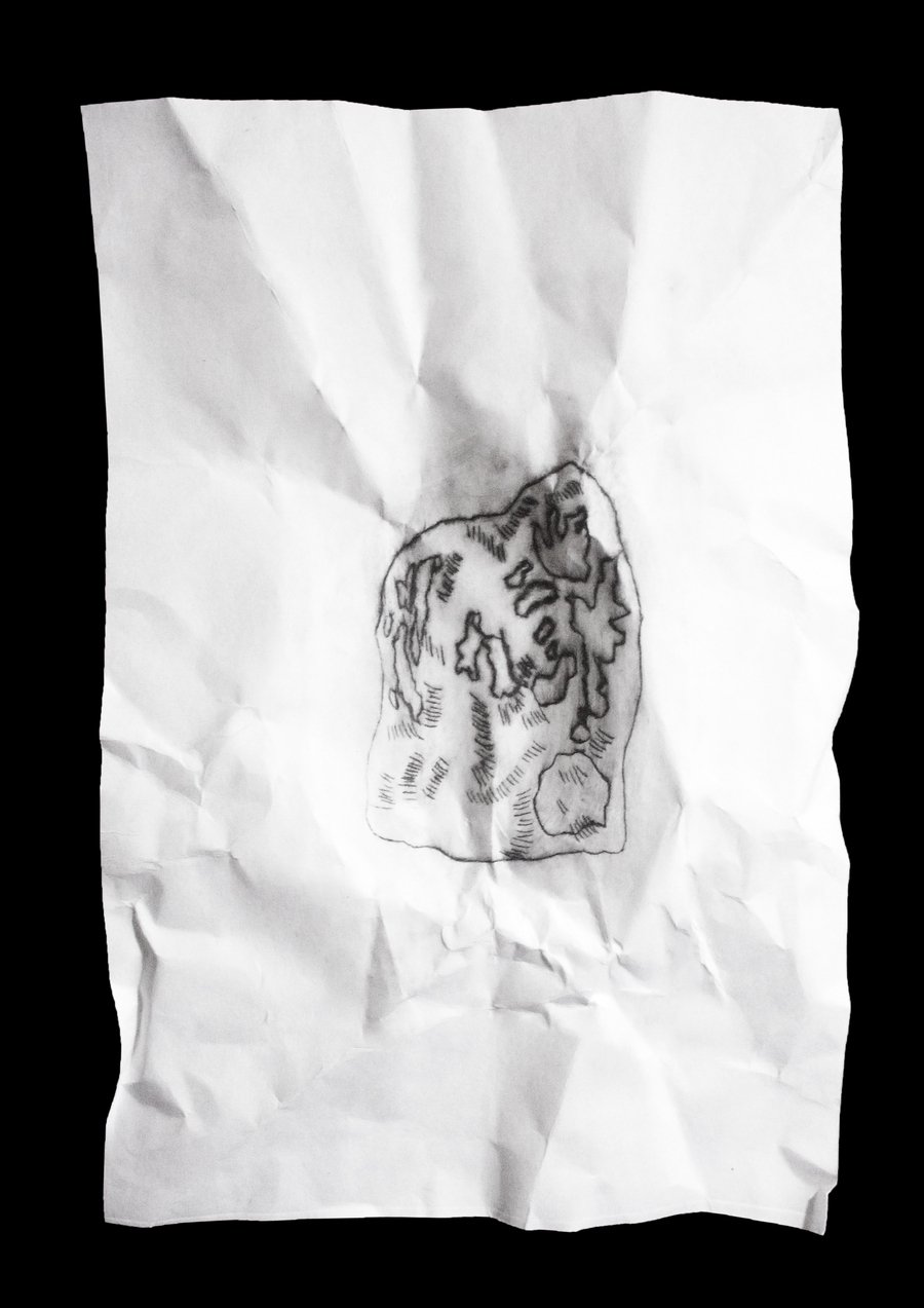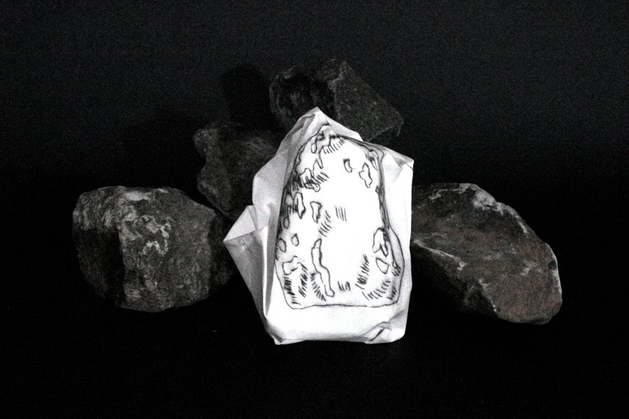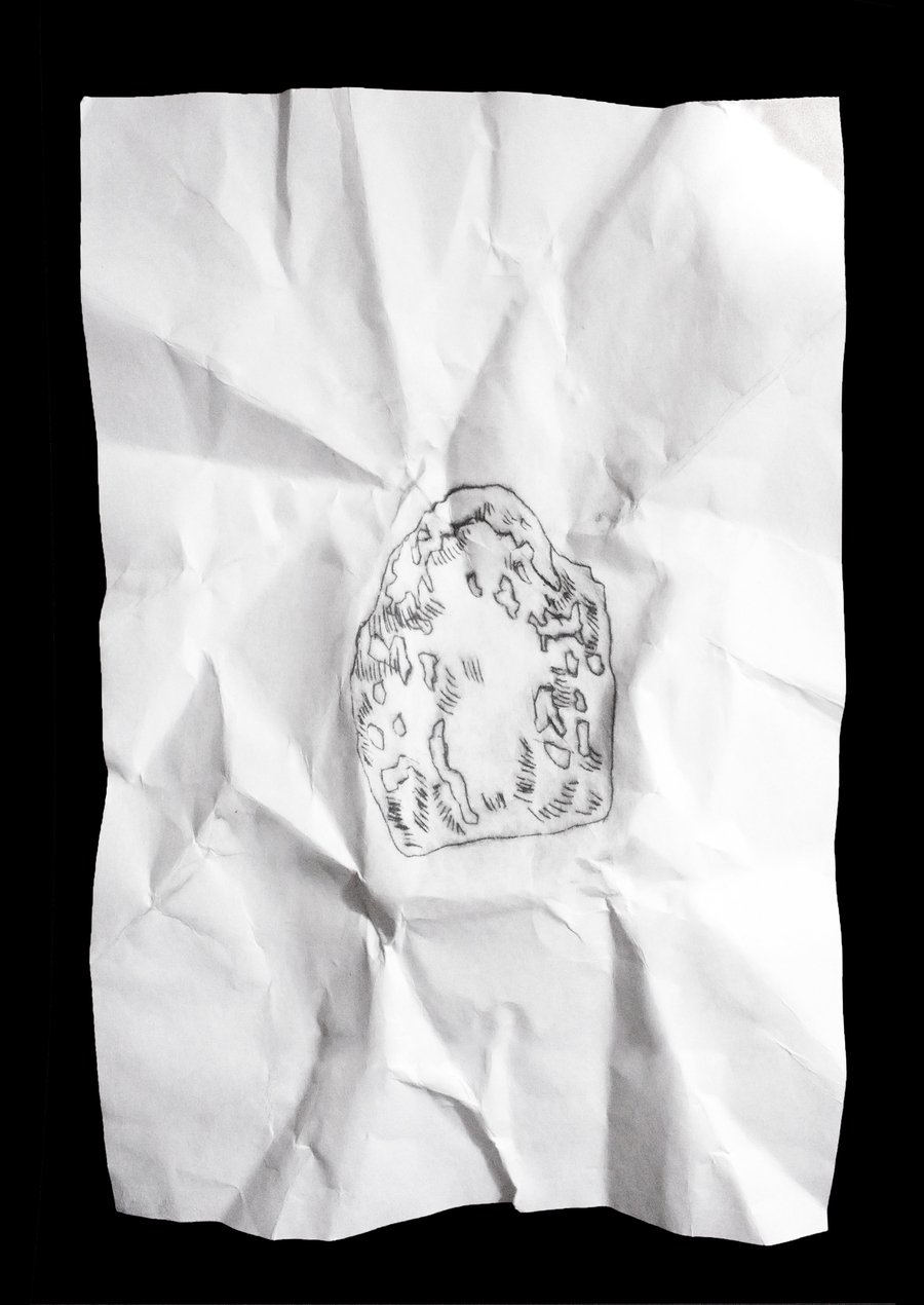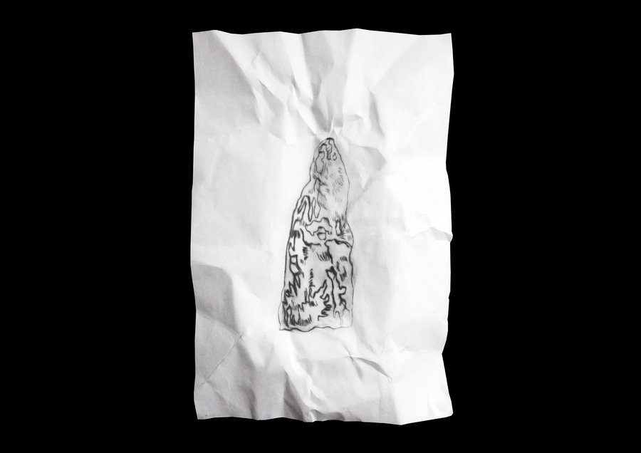 Серия «Менгиры» посвящена первобытной архитектуре и изображает реальные менгиры, встречающиеся в разных уголках мира. Я создаю их образы в технике «сухая игла» на бумаге, а затем оборачиваю оттиски вокруг обычных камней, чтобы придать работе объём. Этот приём (сминание бумаги и использование найденных камней) материализует изображение, превращая его в подобие объёмного макета. Он позволяет зрителю не просто увидеть оттиск, но и тактильно ощутить форму и массу объекта.