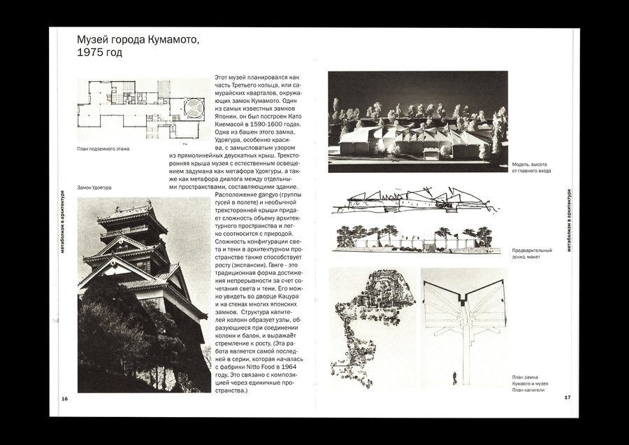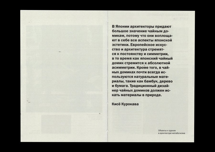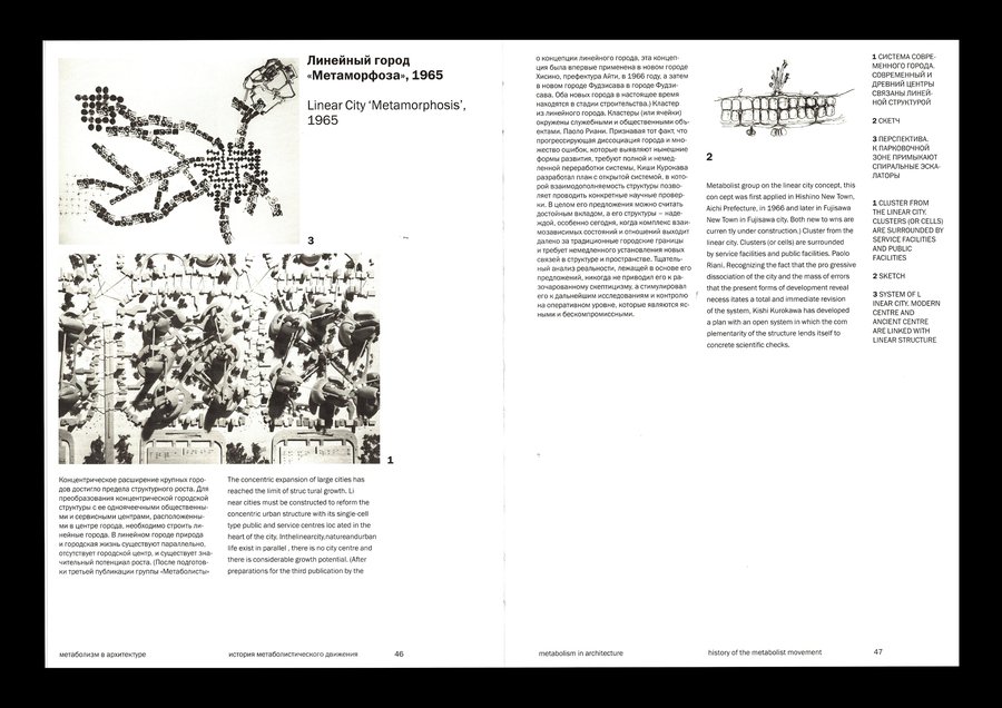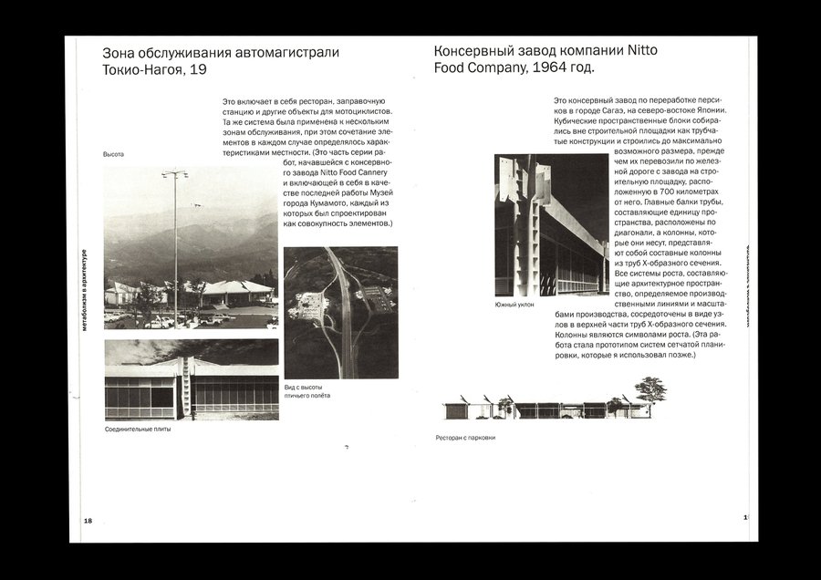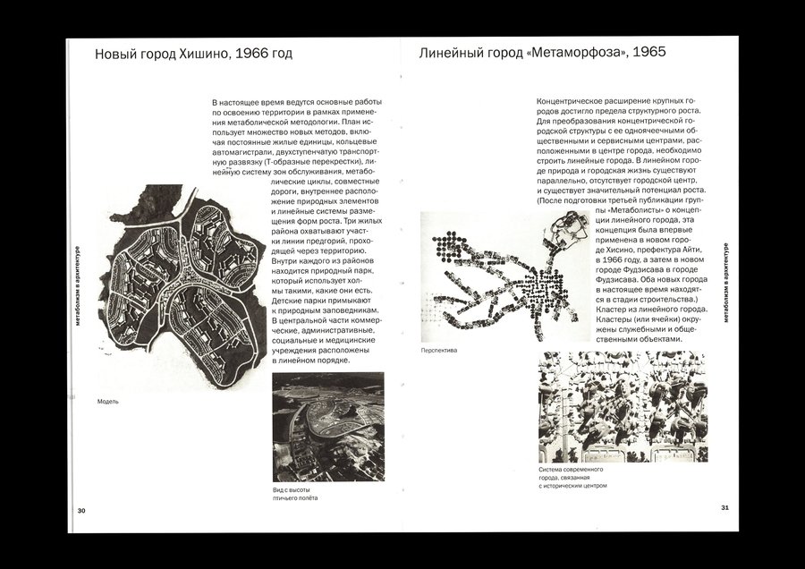 Изображения, выталкивающие текстовый блок, позволяют макету быть динамичным, что перекликается с идеей метаболизма о адаптируемой изменчивой архитектуре.