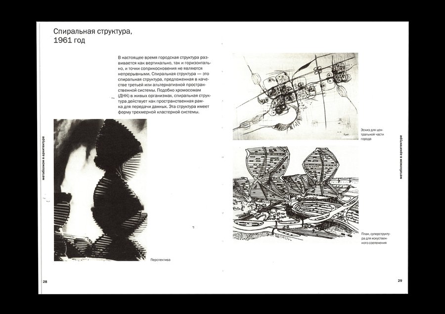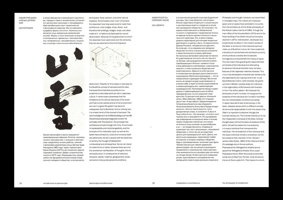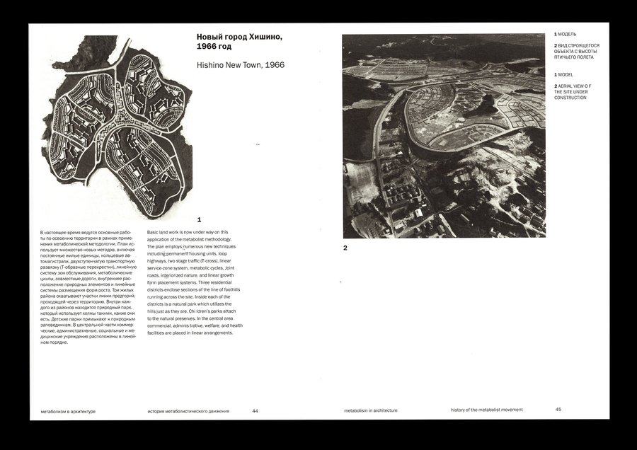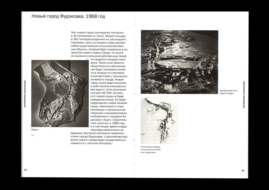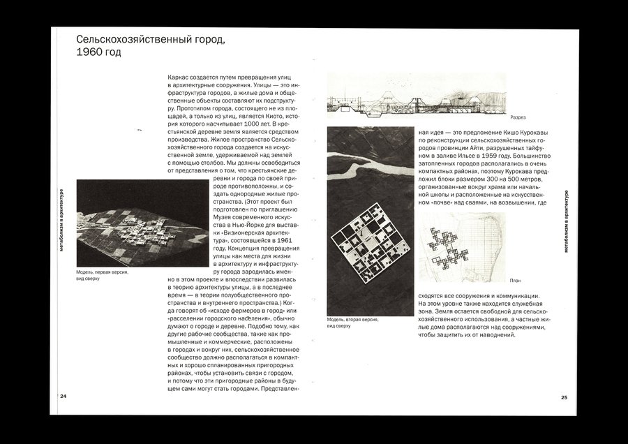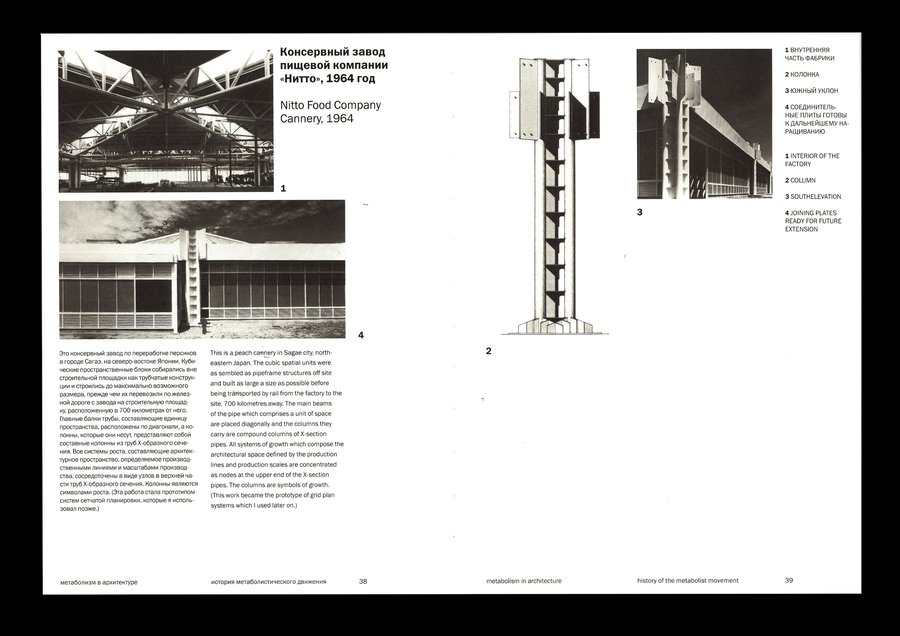 Изображения, выталкивающие текстовый блок, позволяют макету быть динамичным, что перекликается с идеей метаболизма о адаптируемой изменчивой архитектуре.