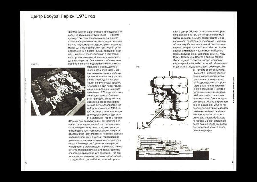 Второй раздел книги рассказывает о конкретных архитектурных объектах, изображения в нём являются акцентом, поэтому вёрстка меняется, колонки смещаются влево для создания разницы между разделами.