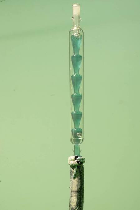 Краска, разведенная водой и заключенная в стеклянную колбу, как будто отсылает нас к баночке с водой для мытья кистей, что близко каждому, кто знаком с живописью с практической стороны.