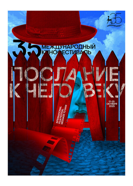 Красный забор как символ преград, разделяющих людей. Сквозь него прорывается лицо, а кинопленка становится голосом, посланием, которое разрушает границы и соединяет мир.
