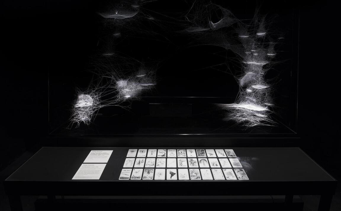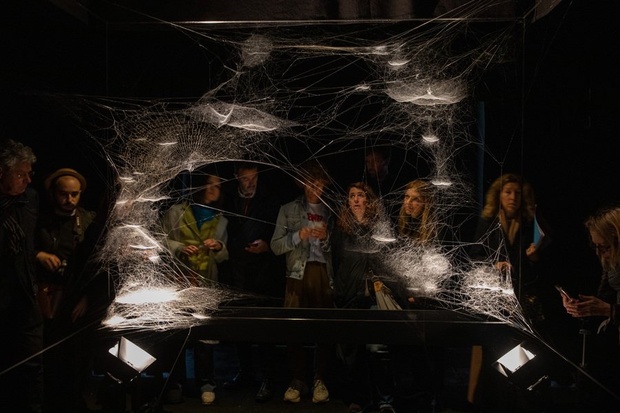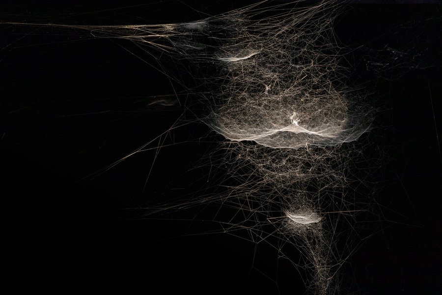 В инсталляциях Tomás Saraceno эстетика формируется из вибраций и тонких структур, созданных пауками. В проектах с паутинными конструкциями визуальный образ возникает из переплетения природной геометрии и световой среды. Паутина фиксирует следы движения животного и становится пространственным рисунком, который невозможно полностью воспроизвести или предсказать.