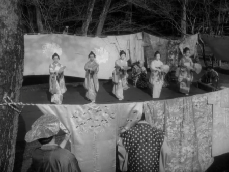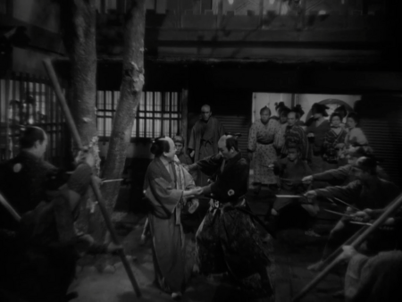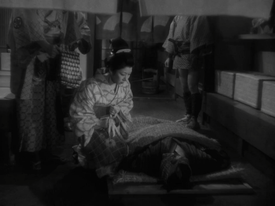 Еще одним ярким примером кропотливой работы с композицией становится сцена из фильма «Жизнь куртизанки Охару», в которой главная героиня узнает о гибели своего мужа. Мидзогути выстраивает кадр, сосредотачивая все внимание на фигуре и лице Охару — ее кимоно выделяется на фоне других, а второстепенные герои расположены таким образом, что мы не видим их лиц, и даже тело мужа накрыто тканью. Горе и смятение Охару выражены в ее сгорбленной, закрытой позе, и весь кадр подчинен скорби, разрывающей ее изнутри.