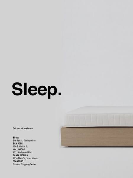 Если говорить о самих плакатах, то они построены на контрасте. Большую часть площади занимает чистый, ничем не заполненный белый фон, продукт же показан только в обрезанном виде. Акцентом в плакате является слово («sleep.» и тд.), которое передаёт функциональность и простоту продаваемых объектов.