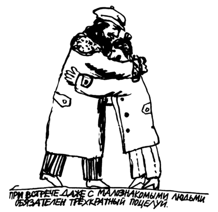 Также подробно описываются эмоциональный ритуал приветствия митьков, правила общения, которые распространяются даже на малознакомых людей и включают в себя троекратный поцелуй при приветствии, долгие объятия при расставании и уменьшительно-ласкательные обращения.