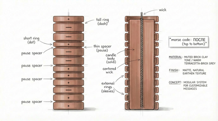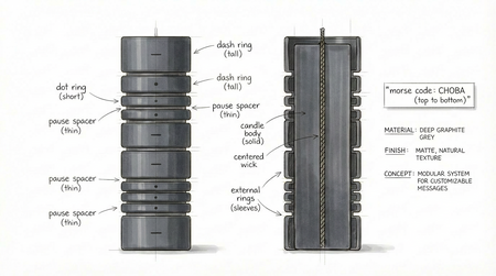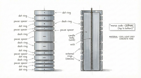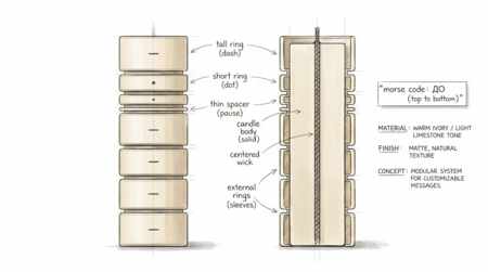 Проект представляет собой серию свечей, в которых язык азбуки Морзе переводится в физическую форму объекта. Каждая свеча имеет форму цельного вертикального цилиндра с фитилём. Сама свеча не является модульной и не имеет сложной конструкции. Вокруг её корпуса размещаются съёмные кольцевые элементы, которые свободно нанизываются сверху.