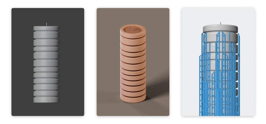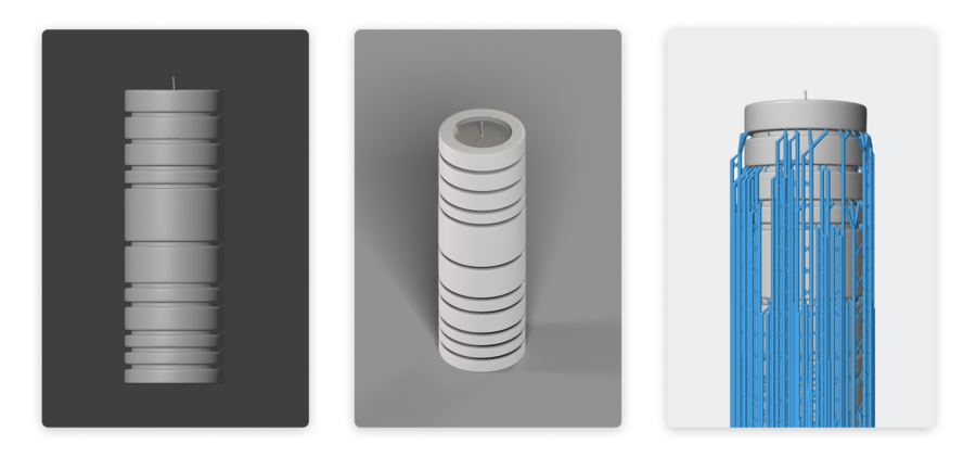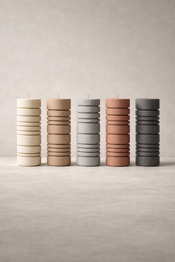 Форма всех свечей одинакова. Различия между объектами создаются только за счёт ритма модулей и цвета. Каждая свеча выполнена в монохромном оттенке, а вся палитра выдержана в спокойных нейтральных архитектурных тонах.