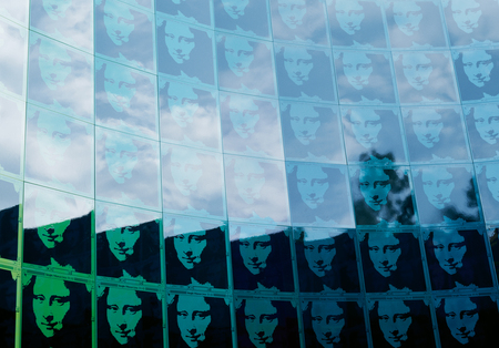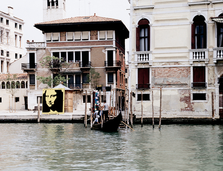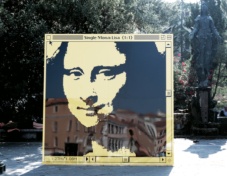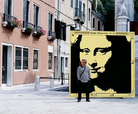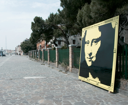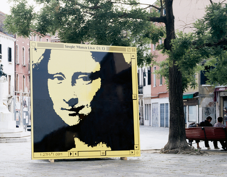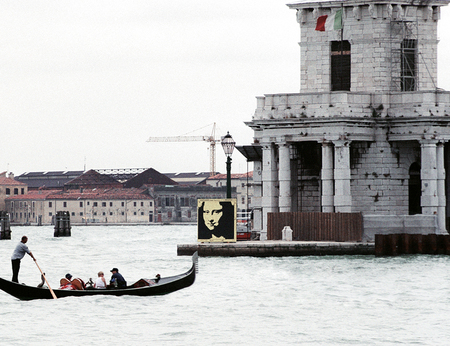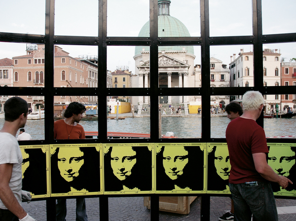 Installation Mona Lisa Goes Venice. Silkscreen on metal, 300×300×5 cm. Installation at seven locations in Venice. 51st International Art Exhibition, 2005