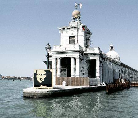 Installation Mona Lisa Goes Venice. Silkscreen on metal, 300×300×5 cm. Left: Campo San Samuele. Right: Punta della Dogana