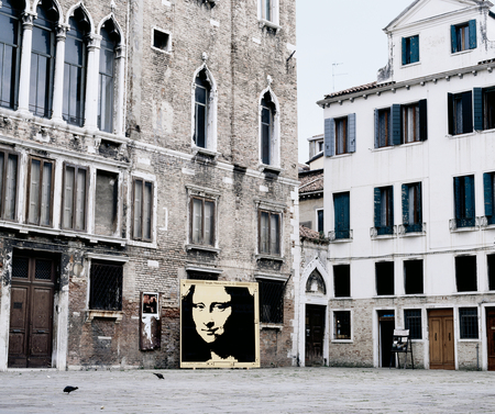 Installation Mona Lisa Goes Venice. Silkscreen on metal, 300×300×5 cm. Campo San Maurizio