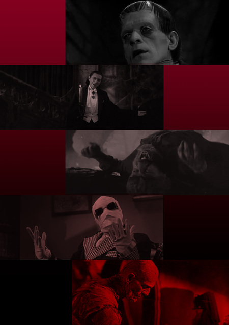 «Дракула"(Dracula, реж. Тод Браунинг, 1931) «Франкенштейн"(Frankenstein, реж. Джеймс Уэйл, 1931) «Мумия"(The Mummy, реж. Карл Фройнд, 1932) «Человек-невидимка"(The Invisible Man, реж. Джеймс Уэйл, 1933) «Человек-волк"(The Wolf Man, реж. Джордж Вагнер, 1941)