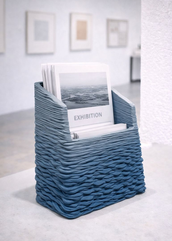 ➞ строго горизонтальные, читаемые слои ➞ плавные волнообразные искажения, возникающие за счёт смещения слоёв ➞ визуальная «усталость» формы, будто она медленно сползает или деформируется со временем ➞ цветовая палитра — приглушённый холодный сине-серый, отсылающий к воде водохранилища, затопившего территорию, и к архивной дистанции. ➞ поверхность матовая, с явной читаемостью печатных линий