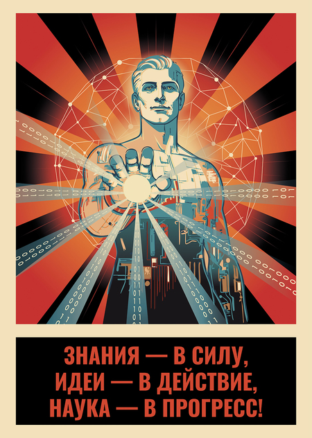 In today’s world, neural networks are becoming an integral part of our lives. They enter various areas, optimizing production processes. This poster, carried out in a bright, creative style, symbolizes a bright, technological future. It conveys the idea that AI is a powerful catalyst that helps humanity to move forward and implement knowledge, IDEI and SCIU in order to achieve global progress.