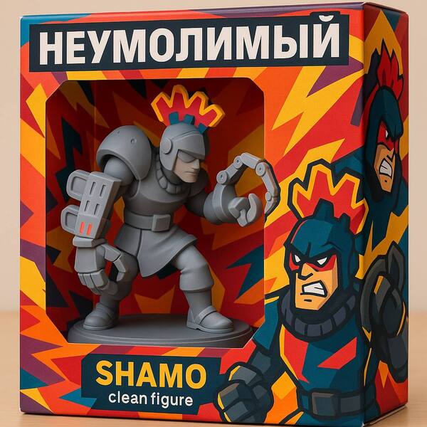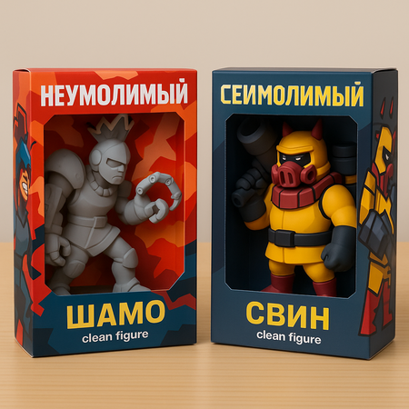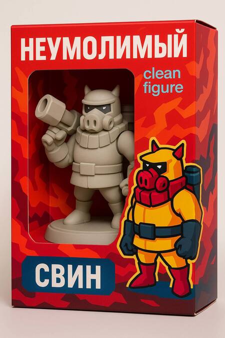 Based on the generated image, create a boxses. The characters in the box should be gray, and the figures should not be painted. The image should be realistic, as if it were photographed for a website. The boxes should be labeled «НЕУМОЛИМЫЙ» and «clean figures.» Character 1, the pig, should be named «Свин,» and character 2, the cyborg, should be named Шамо.»