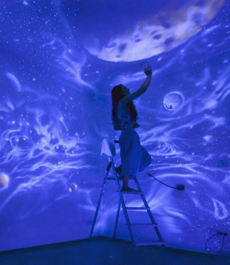Иммерсивные инсталляции с использованием ультрафиолетового света создают пространство, которое раскрывается при участии зрителя. В таких работах изображение больше не привязано к плоскости — оно проявляется в самом помещении и меняется в зависимости от движения и освещения.