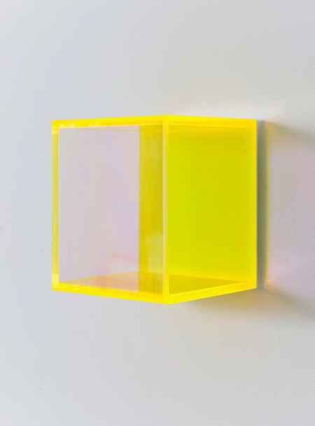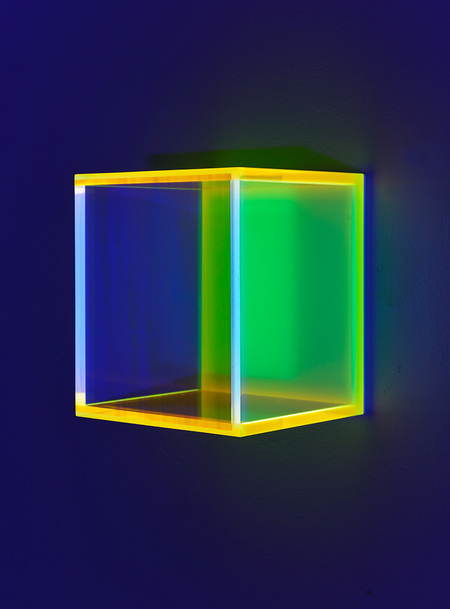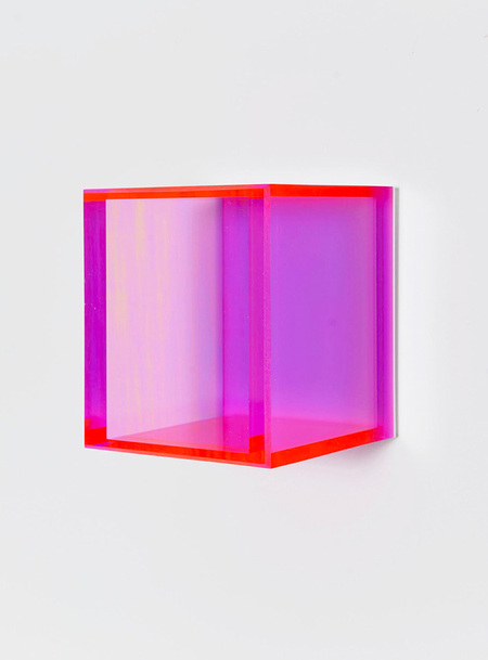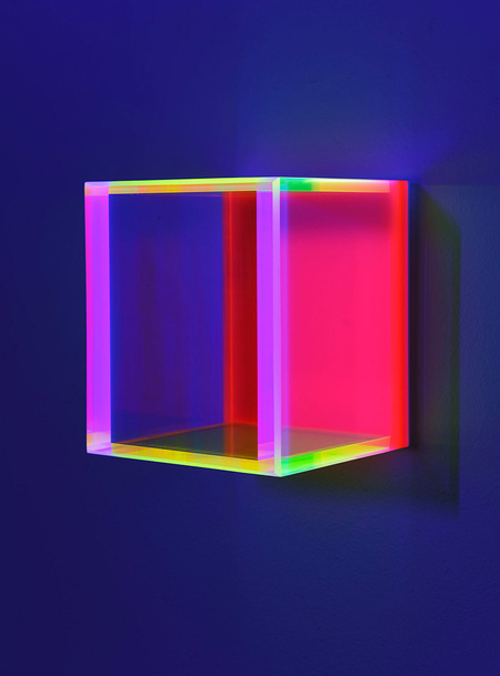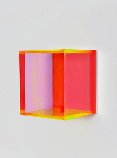 В работе «Colormirror Rainbow Wien» пространство формируется за счёт флуоресцентного акрилового стекла, которое реагирует на изменения освещения и угла взгляда. Модули, собранные в геометрические конструкции, демонстрируют сложное взаимодействие цветовых плоскостей: при естественном свете они кажутся сдержанными и прозрачными, но под ультрафиолетом их поверхности начинают излучать интенсивное свечение. Перекрывающиеся слои создают оптические сдвиги и мягкие градиенты, благодаря которым объект воспринимается не как статичная форма, а как динамическая световая структура.