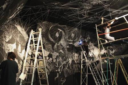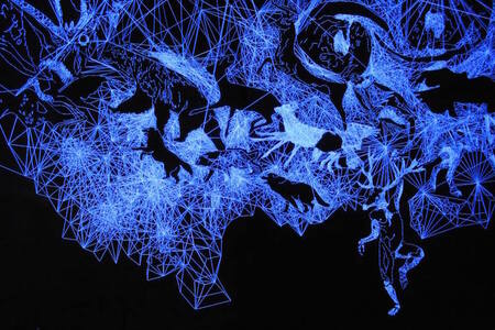 Проект «Stellar Caves» предлагает зрителю войти в пространство, где потолки и стены превращены в светящиеся «созвездия», созданные из хлопковых нитей, покрытых УФ-краской. Нити натягиваются между множеством точек крепления и образуют фигуры животных и мифологических существ, которые проявляются только в ультрафиолетовом освещении. В темноте такие конструкции напоминают фантазийные пещеры или ночное небо, создавая эффект погружения в иной, почти мифический мир.