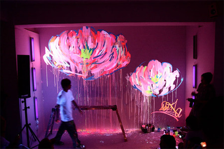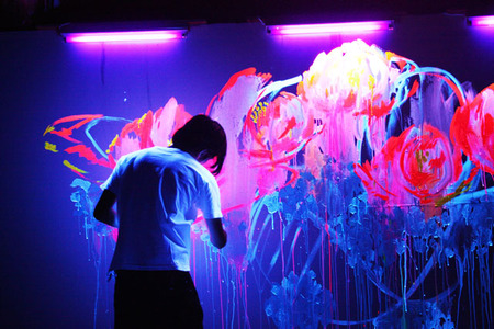В серии «День и ночь» японский художник использует флуоресцентные краски и чёрный свет, создавая работы, которые меняют свой облик в зависимости от освещения. Его динамичные цветочные формы превращаются под УФ-светом в яркие неоновые вспышки, напоминающие ночные огни Токио. Художник соединяет природный мотив с визуальностью мегаполиса, показывая, как световая среда способна полностью изменить восприятие изображения.