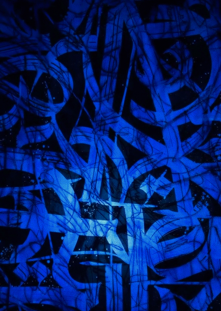 Если в одних работах флуоресценция используется для создания двойного образа, то в других она становится способом построения сложных оптических структур. В таких произведениях поверхность холста превращается в многослойное поле, где флуоресцентные краски образуют ритмические узоры и спиральные линии. Под УФ-светом эти элементы начинают проявлять дополнительную глубину: плоскость кажется пульсирующей, линии распадаются на световые фрагменты. Изображение утрачивает статичность, и зритель воспринимает картину скорее как динамическое визуальное событие, чем как фиксированный объект.