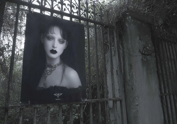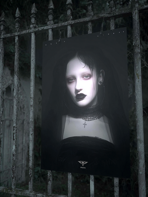 Промпт обложки: Midjourney — a large poster with the face of an attractive woman in black lipstick and pale skin is hung on iron bars. the word «nostalgia» appears below it, in the style of dark fantasy and gothic horror. --p 9alqh1n