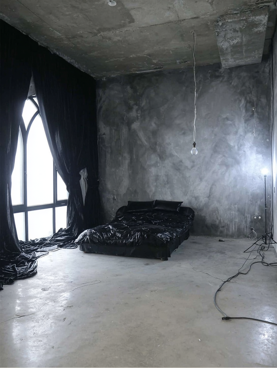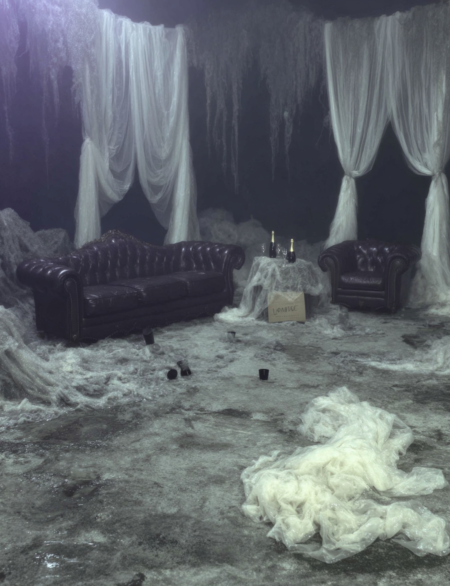 1. Midjourney — a photograph of the corner in an empty concrete room with black walls and gray carpet. there is one large dark brown leather couch against two white curtains on each side. there is a table covered by a cardboard box that has «» written on it, as well as several bottles of champagne and glasses on top of it. there is also another small sofa near it. the floor is covered in gray fabric, and black plastic beer cups are scattered around the scene. --p 9alqh1n 2. Midjourney — interior photo of an empty room with gray plaster walls, black curtains on the left side, and a large window in front. a black bed is against one wall, and the concrete floor has a power cable hanging from the ceiling to a light bulb on the right-hand side. there is no visible furniture or decoration, suggesting a studio lighting setup. --p 9alqh1n