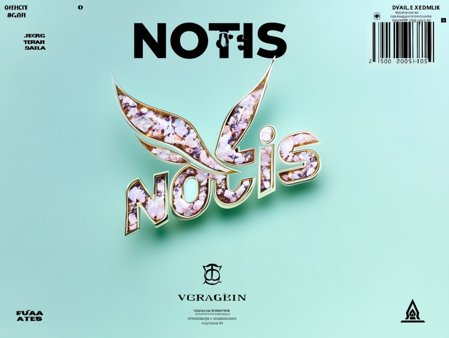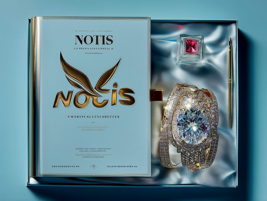 luxury jewelry brand logo with text «jeni notis» on a light blue background, featuring a diamond necklace and bracelet, hyper-realistic and detailed