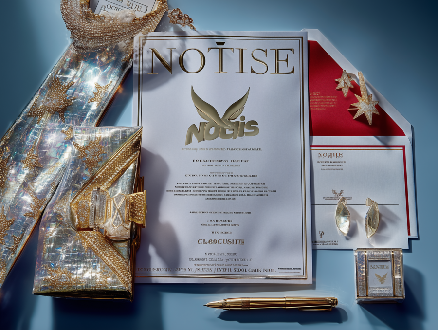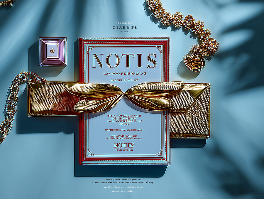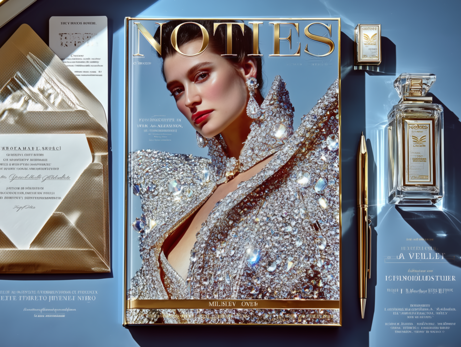 mockup of printed paper materials (paper, envelope, business card, pen) on a blue background for the jewelry store «Notice», white, gold, blue colors, modernity, audacity --chaos 25 --ar 2:3