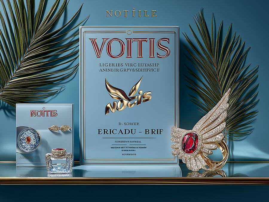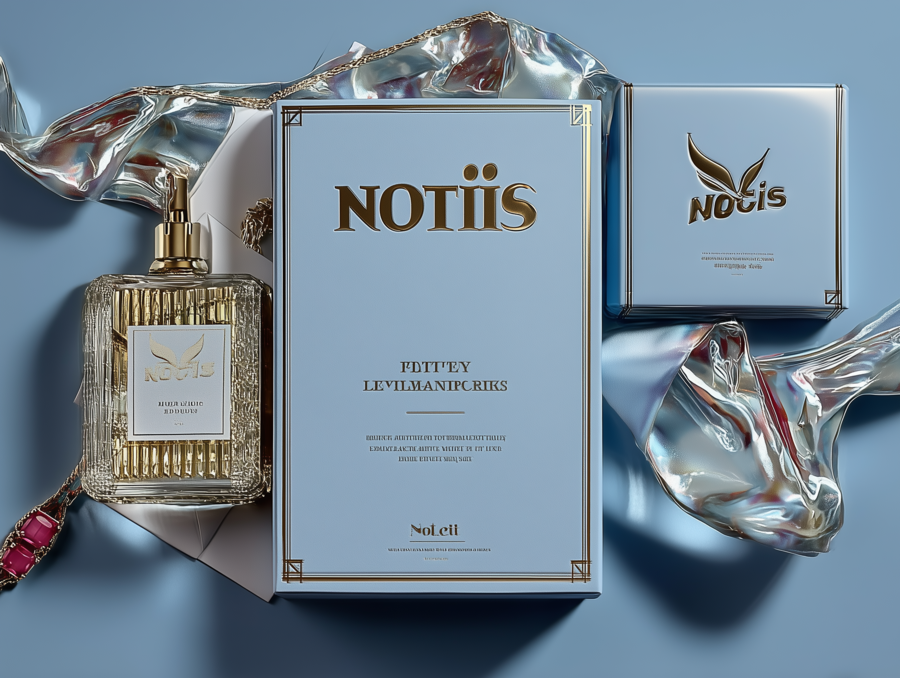 an expensive cosmetics case, the main colors are gold and blue, jewelry brand «Notis»