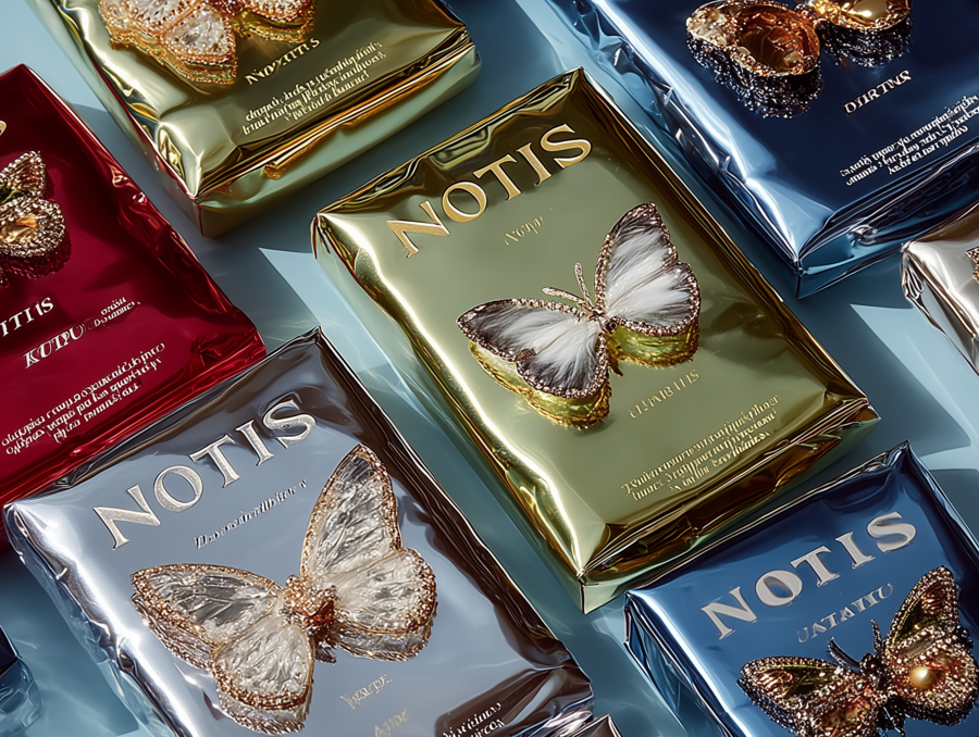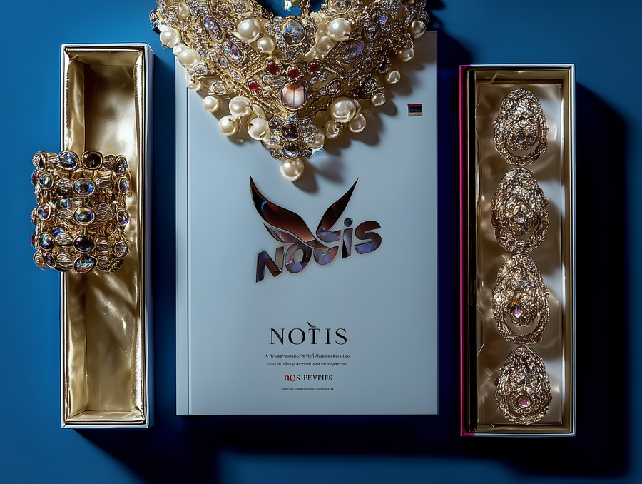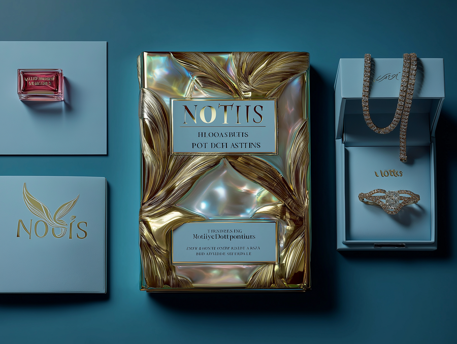 open packaging for jewelry brand «Notis», the main colors are gold and blue