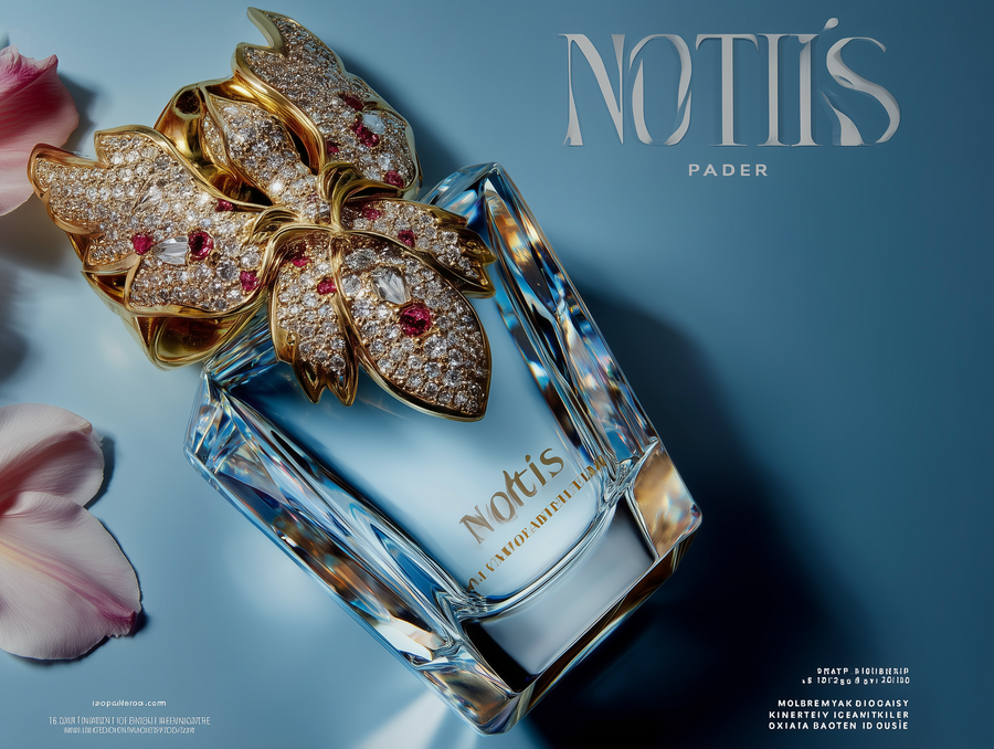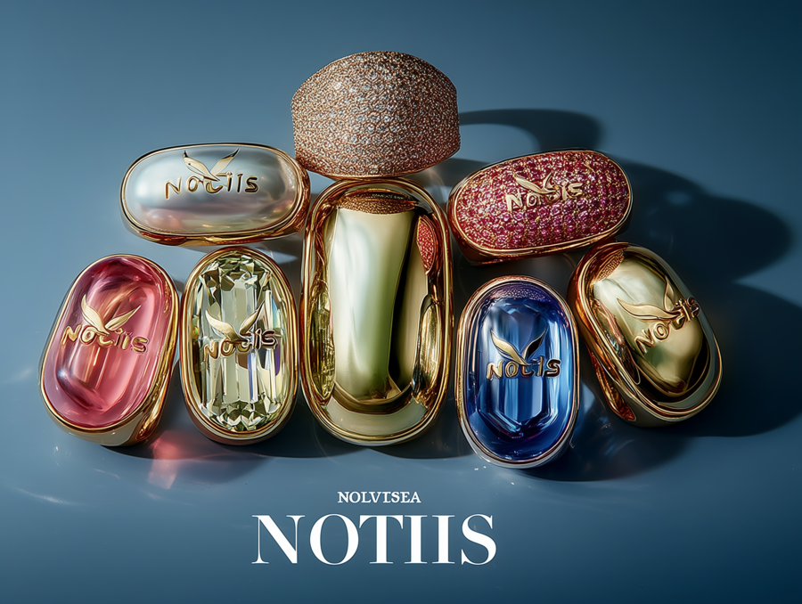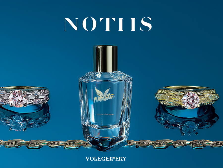 advertisement for perfume jewelry from the jewelry brand «Notis», lots of gold, blue background